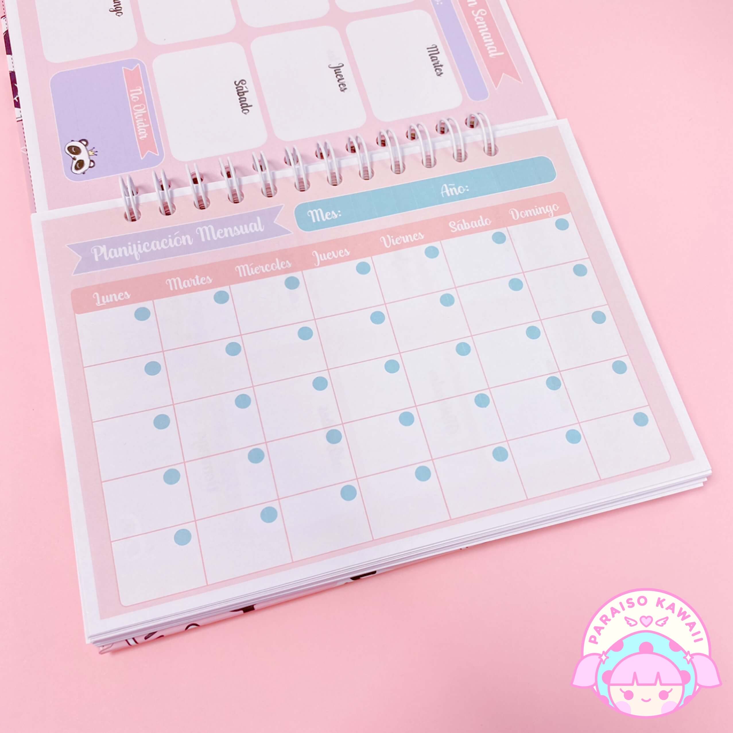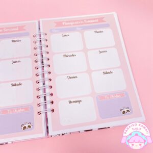 Planner Anual sin fecha tamaño A5 (21 x 15cm) con hojas de diferentes colores. Trae: