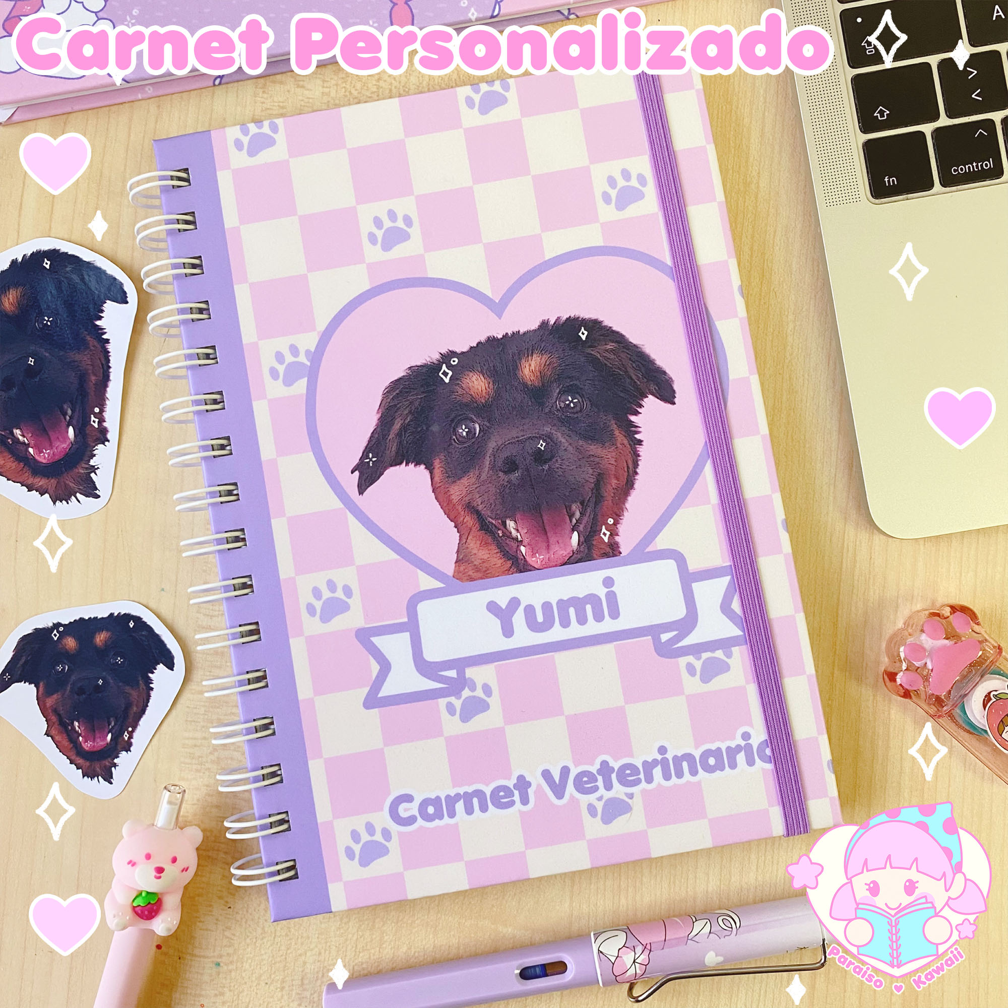 Hermoso carnet veterinario completamente personalizado para tu mascota. Debes mandarnos una fotito de tu perro o gato en buena calidad que se vea bien su cabeza, para poder editar la foto para la portada. Incluye stickers de regalo de tu mascota.