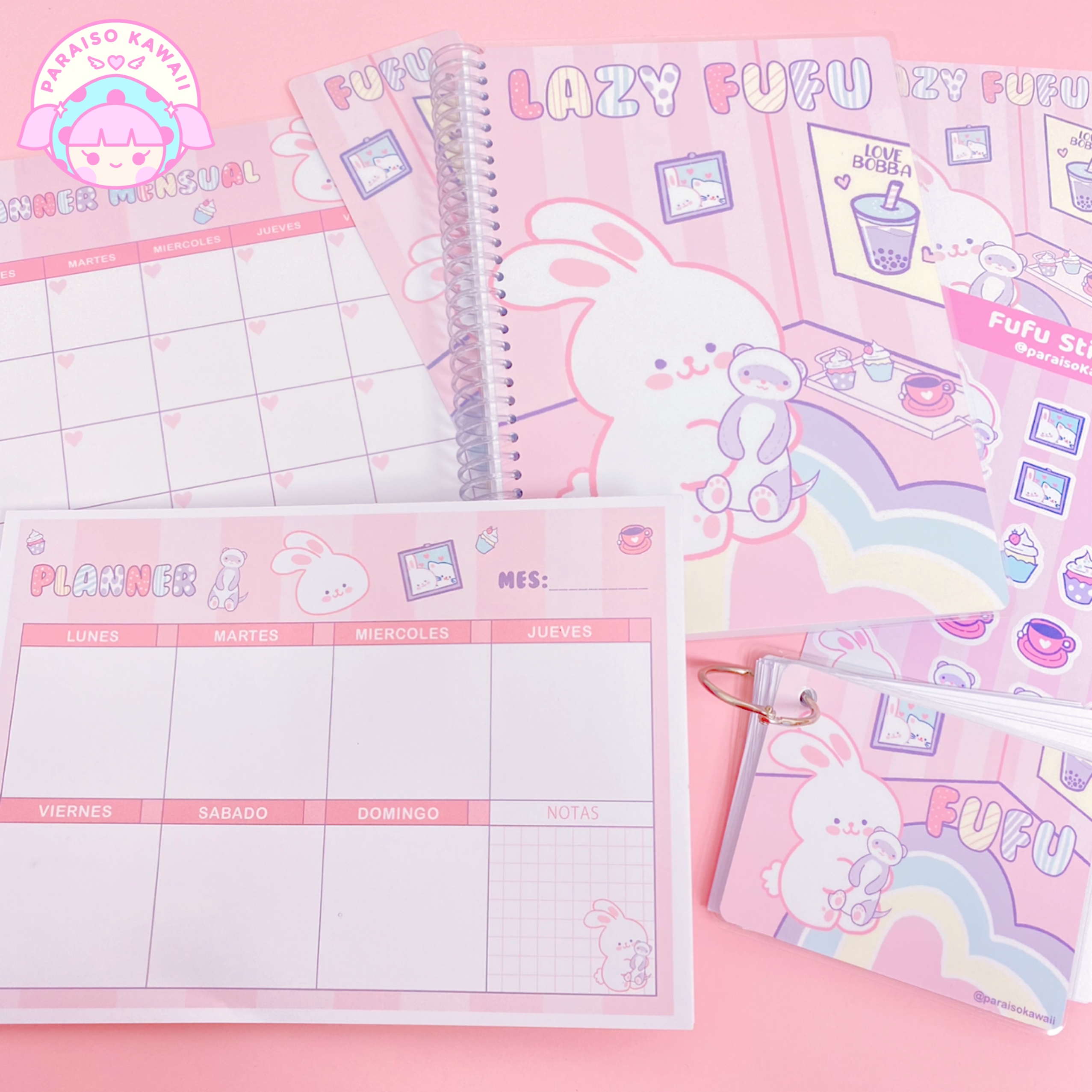 Set de papeleria del conejito Fufu. Este diseño es exclusivo de Paraiso Kawaii y todo esta hecho a mano por nosotras. Este set contiene: