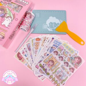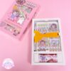 Set con 32 tiras de stickers sin troquelado, por lo que viene con un cuchillo tipo bisturi y un mat de corte para que puedas cortarlos tu mismo. Por dentro tanto este como el set rosado son iguales, solo cambiar el color de la caja. El washi tape se envia al azar y es distinto en casi todos los sets independiente del color de la caja.