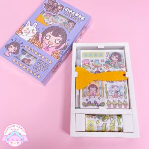 Set con 32 tiras de stickers sin troquelado, por lo que viene con un cuchillo tipo bisturi y un mat de corte para que puedas cortarlos tu mismo. Por dentro tanto este como el set rosado son iguales, solo cambiar el color de la caja. El washi tape se envia al azar y es distinto en casi todos los sets independiente del color de la caja.